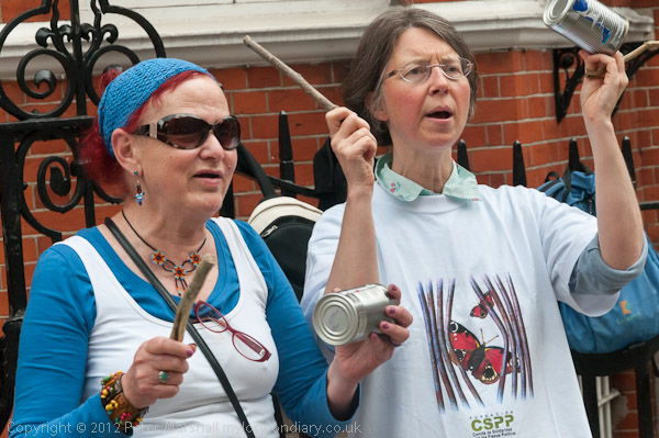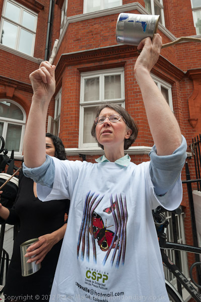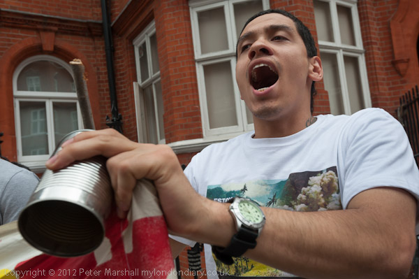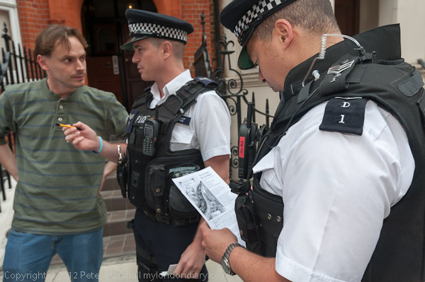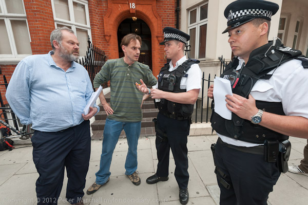 ![]() ![]() ![]() ![]() ![]() Police talk to the protesters and read the leaflet ![]() ![]() The building also has the Ecuadorian embassy |