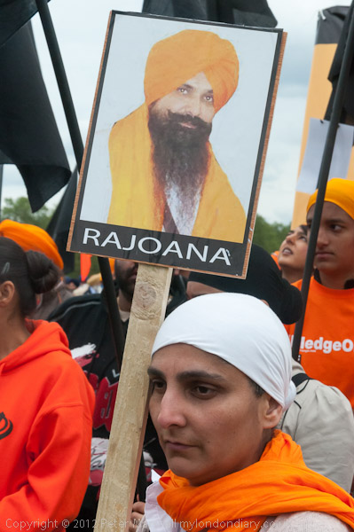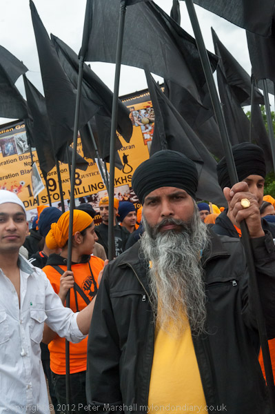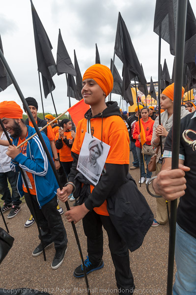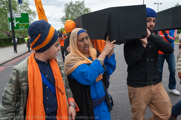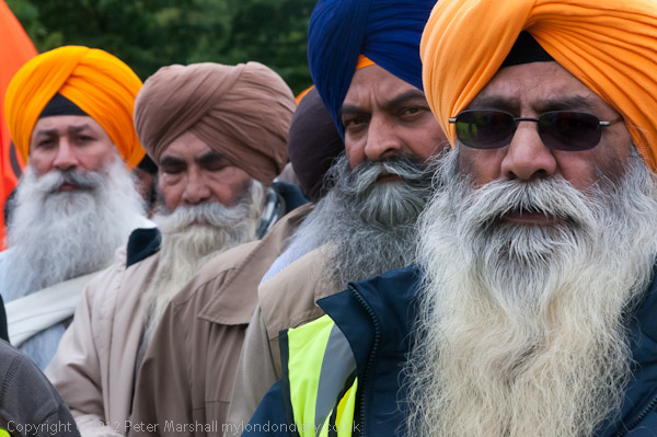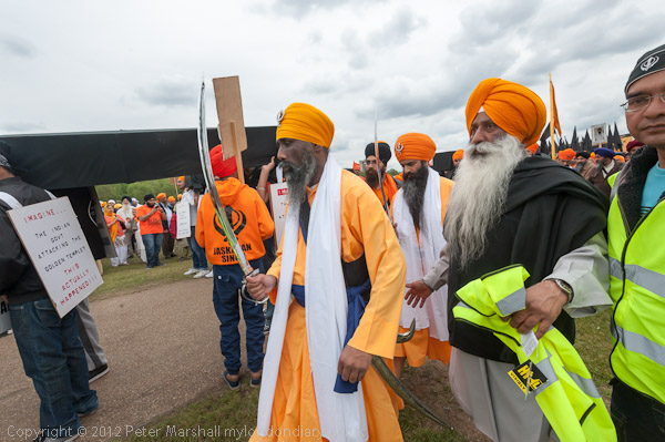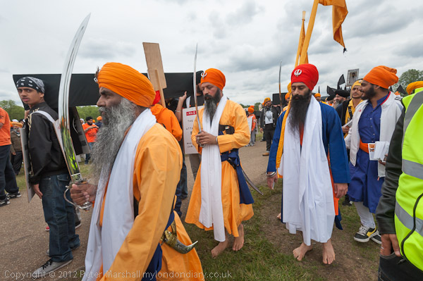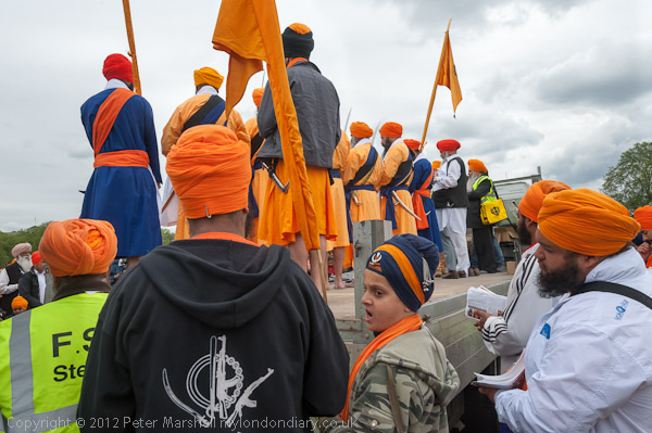 Getting ready to start marching with the Sikh flags in front of the Panj Pyare with raised swords