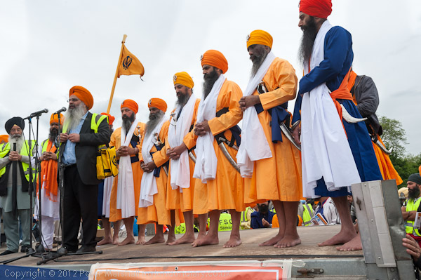 Khalsa including the Panj Pyare on the platform in bare feet before the march