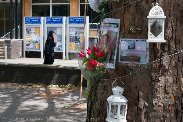 Banner, flowers, posters and candles for Ricky Bishop, killed in Brixton Police Station
