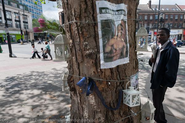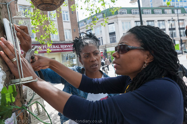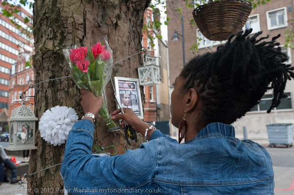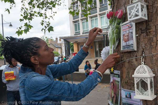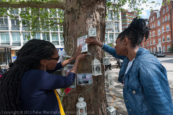 Samantha and Marcia, Sean Rigg's sisters, frame pictures of him to fix to the memorial tree