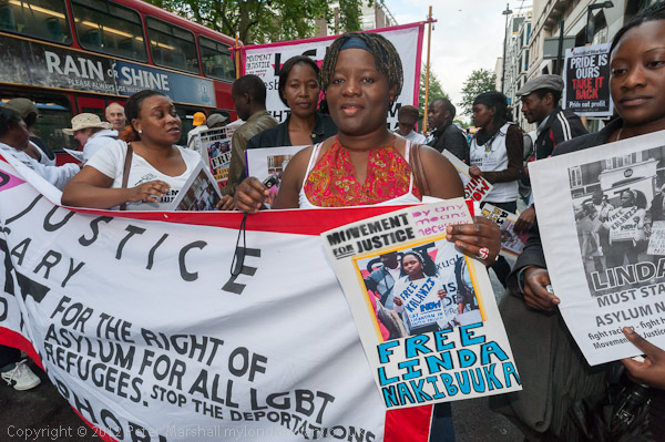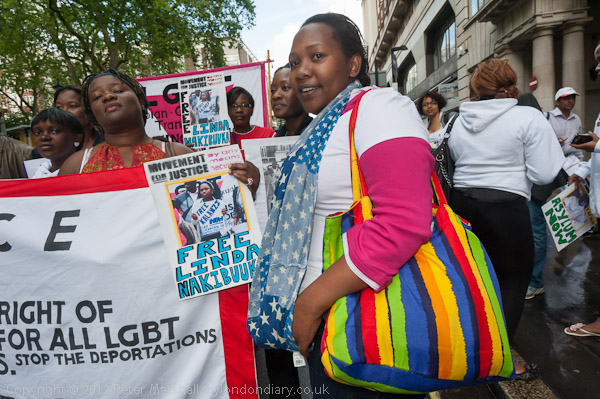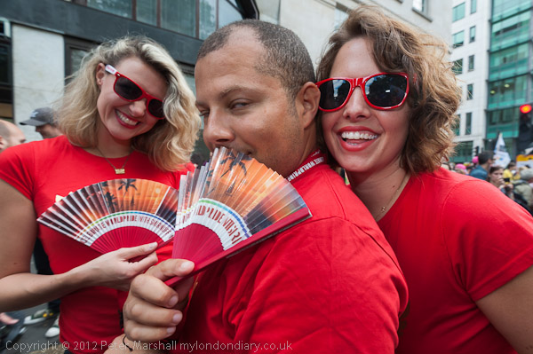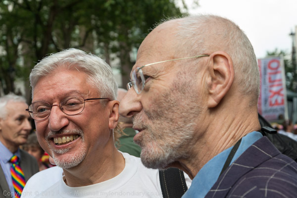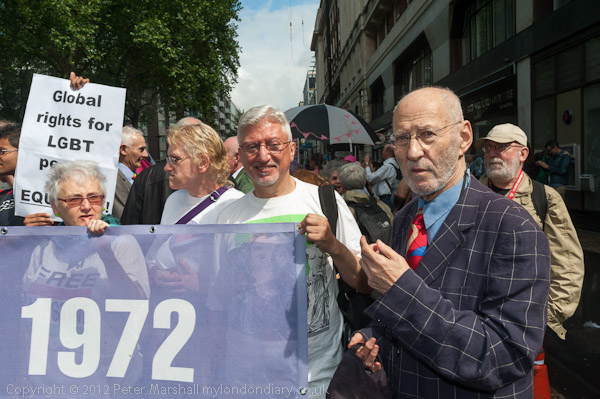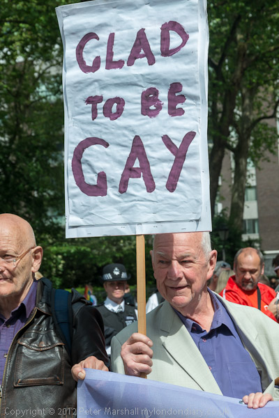 Peter Tatchell at the front of the march with a placard calling for Global LGBT Equality