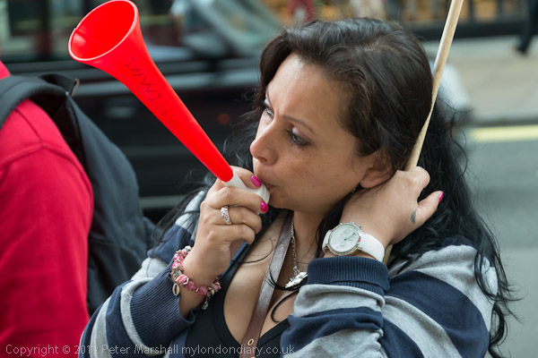 A young protester adds his voice on the horn