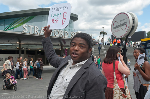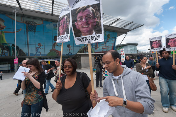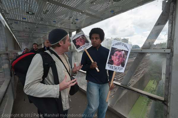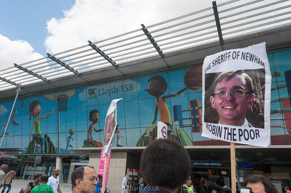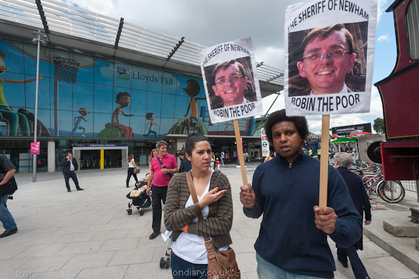 Placards showing Newham Mayor Sir Robind Wales as 'The Sheriff of Newham Robin the Poor'