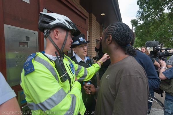 The police officer argues with Joe Alexander of CARP who has taken previous tours into the block without problems