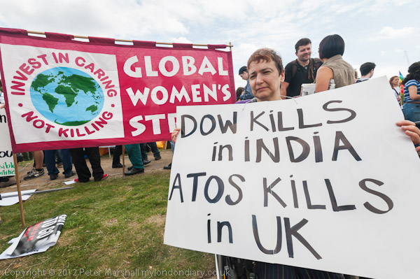 Global Women's Strike banner and a poster against killers Atos and Dow