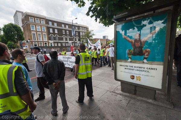 The march is watched by Olympic helpers as it goes past an Olympic advert