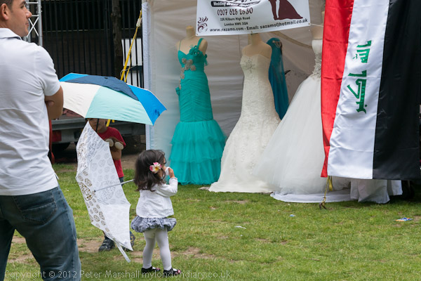 Children with umbrellas in front of the Sazamo boutiqe stall