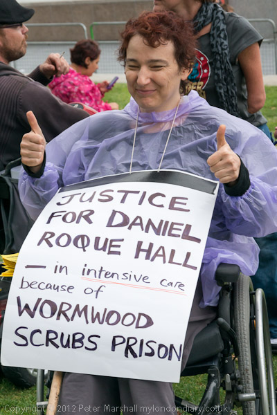 Clare Glasman with a poster calling for Justice for Daniel Roque Hall whose treatment by Wormwood Scrubs put him in intensive care