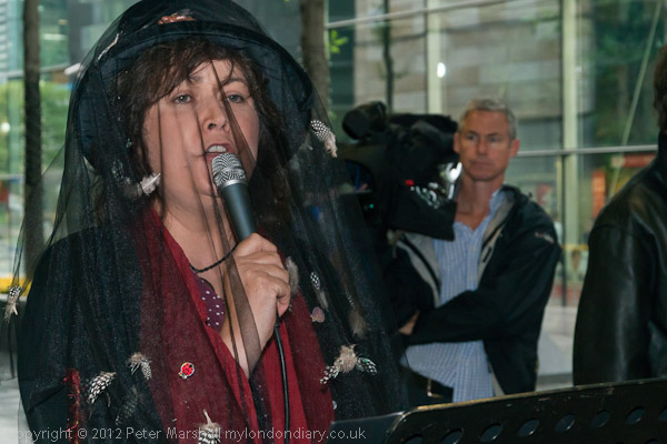Claire Glasman of Winvisible with a poster about June Mitchell, found fit to work when dying from lung cancer