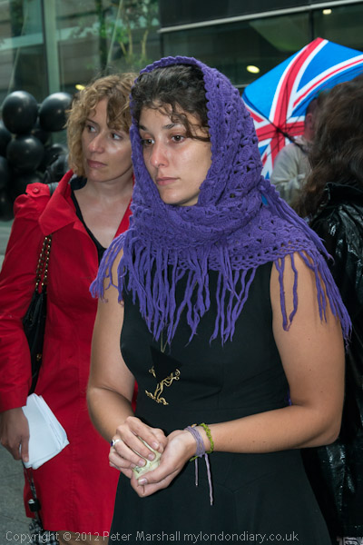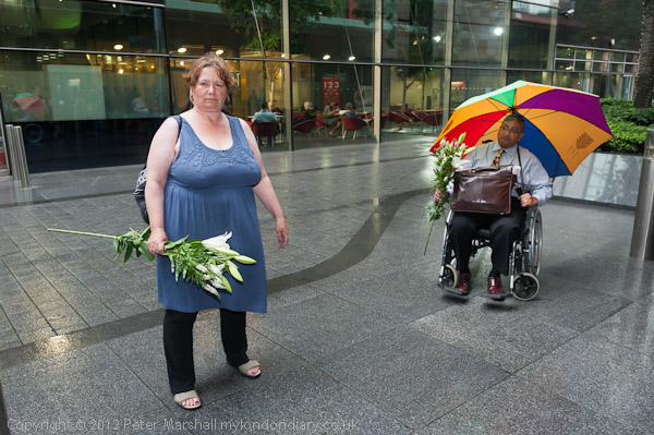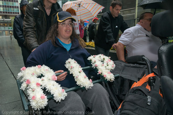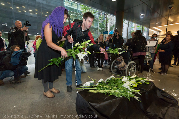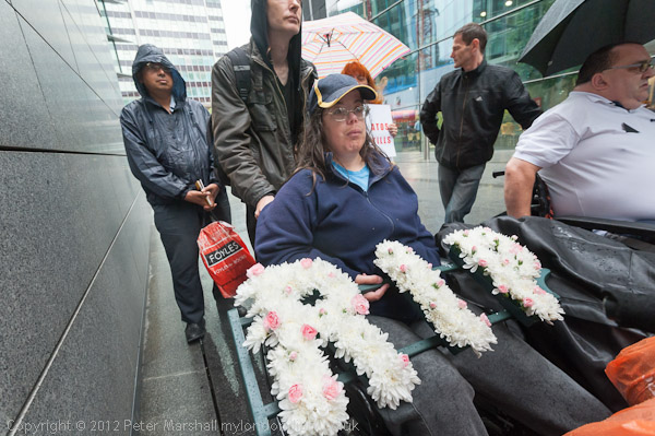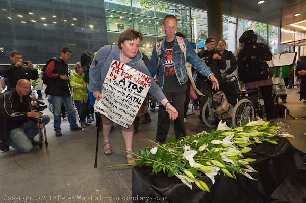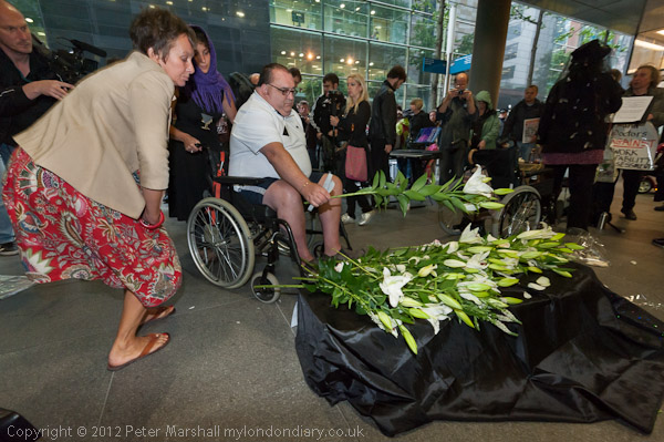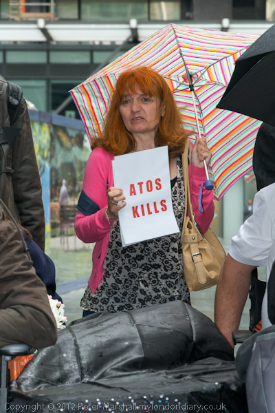 A coffin and wreath are brough up by four people on wheels with a woman carrying a placard 'Atos Kills'