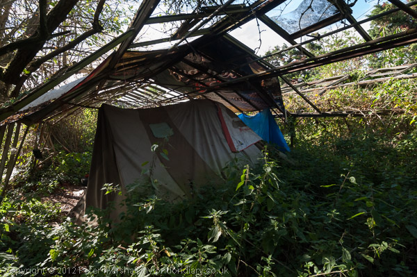 Others still sleep in tents, like this one under a ruined greenhouse.