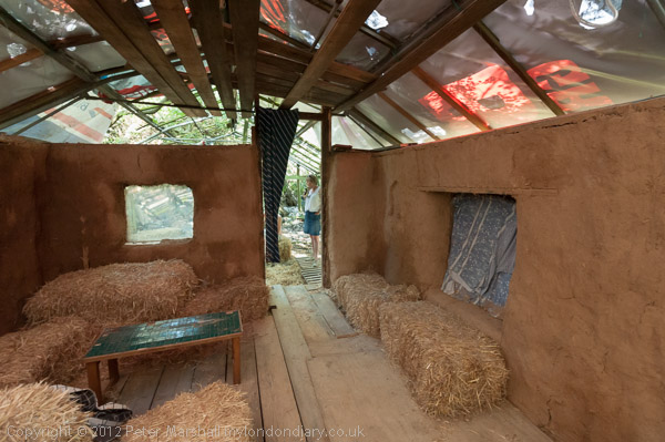 Its interior with staw bales for seating. Virtually all the material comes from the site or is given free by locals