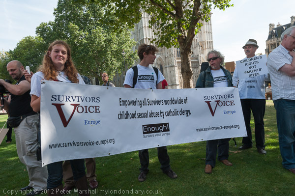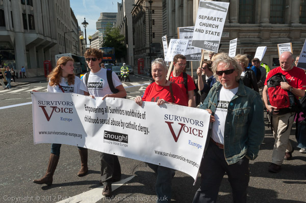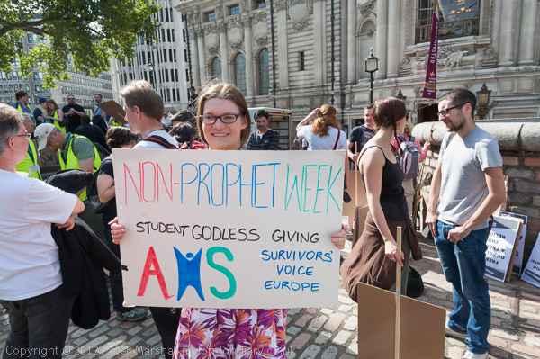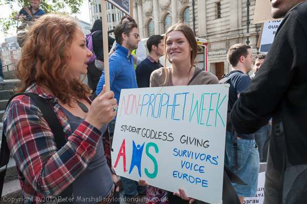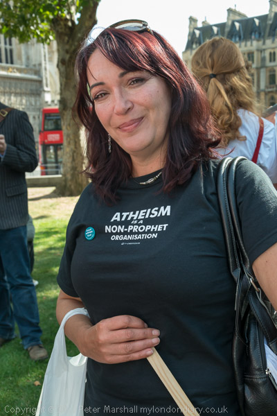![]() 'Non-Prophet Week' poster ![]() Peter Tatchell being interviewed. The march started outside Methodist Central Hall and opposite Westminster Abbey ![]() ![]() Survivors Voice banner - supporting victimes of childhood sexual abuse by Catholic clergy ![]() 'Atheism is a non-prophet organisation' t-shirt ![]() 'Secularism Protects our Human Rights' and other placards from 'Secular Europe' |