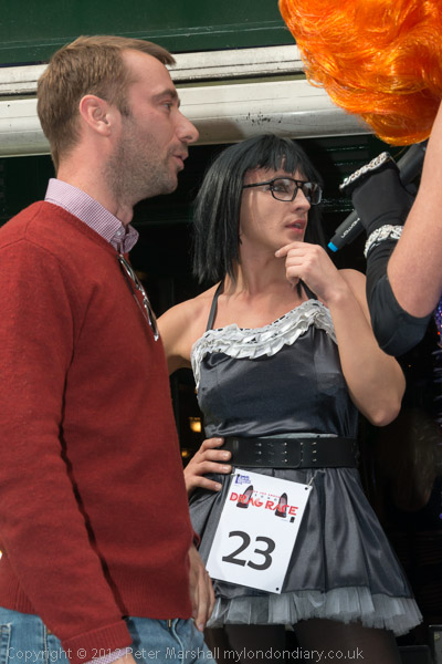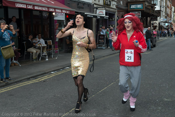 A contestant found it "bloody impossible" to run in these heels. Contestants could also complete as a three-legged pair, one with a little dress slippage