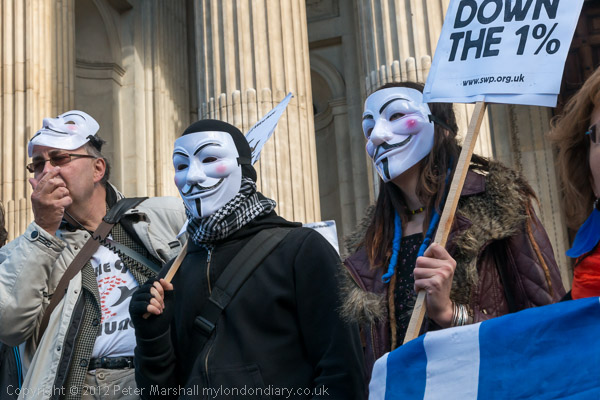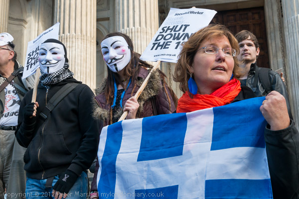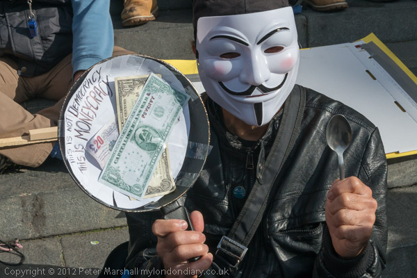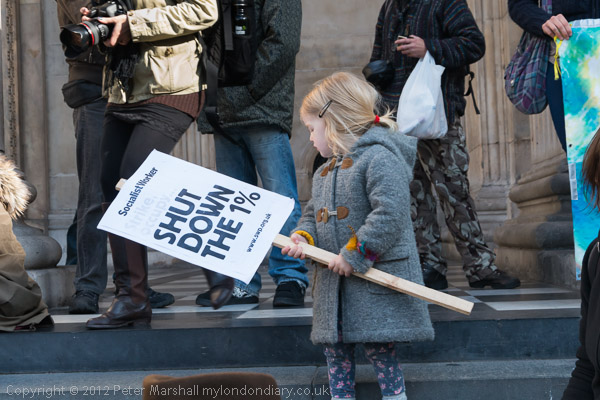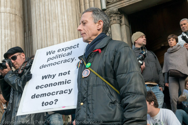 Peter Tatchell with his own placard 'We expect political democracy. Why not economic democracy too?'