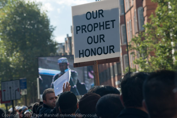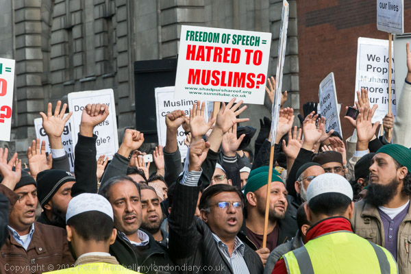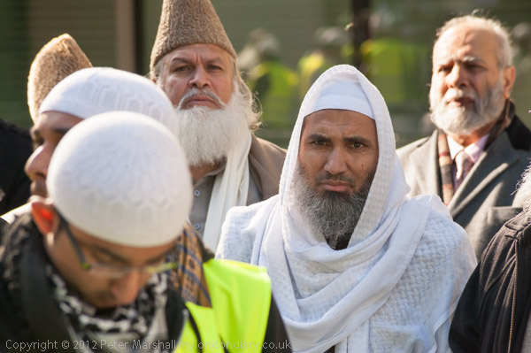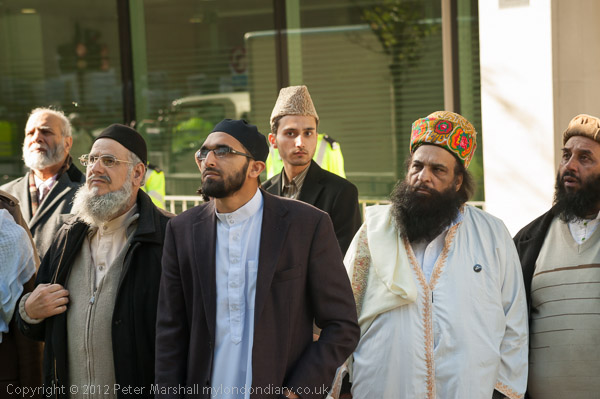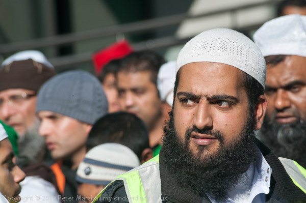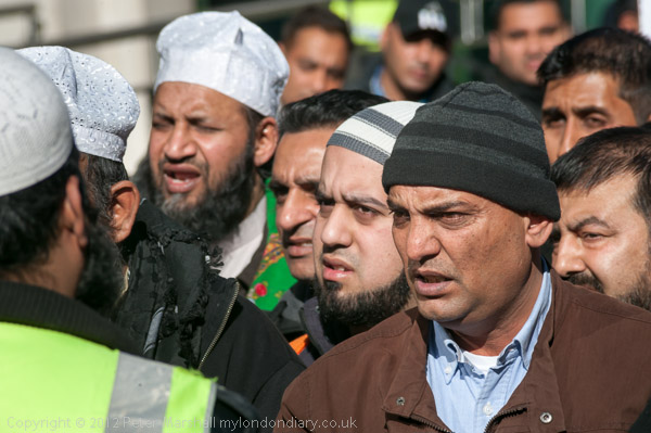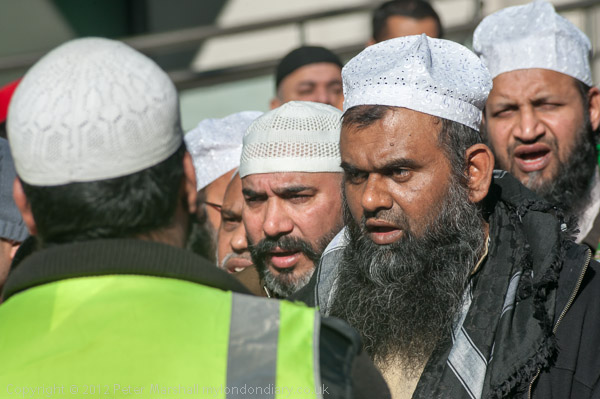 At first the protest was in one carriageway only and a large pen was filled with Muslim men, with speakers and screen at the far end