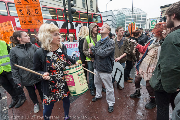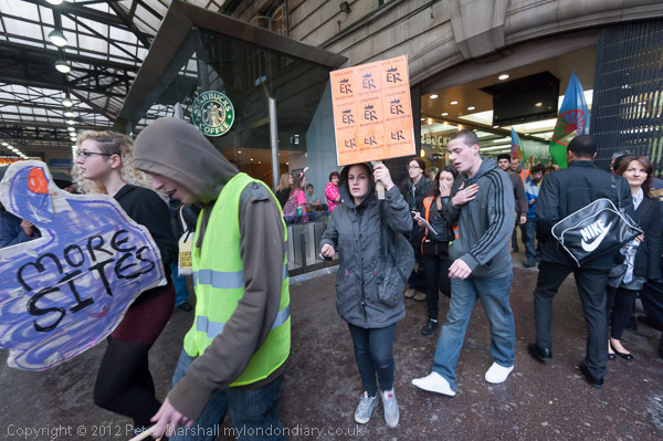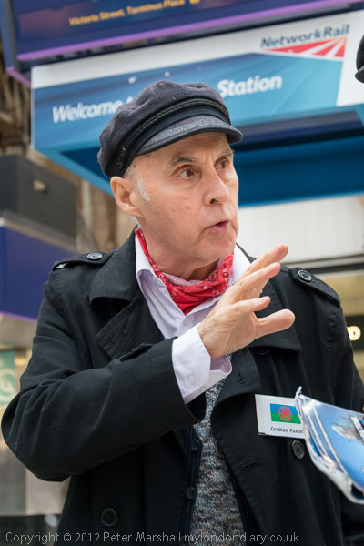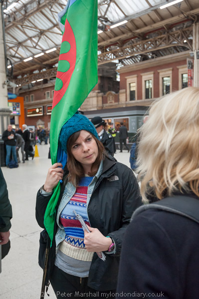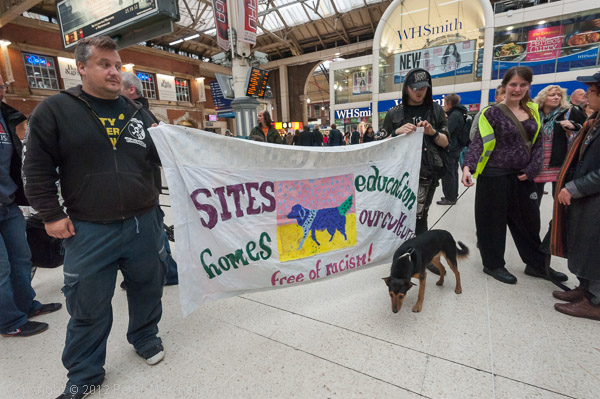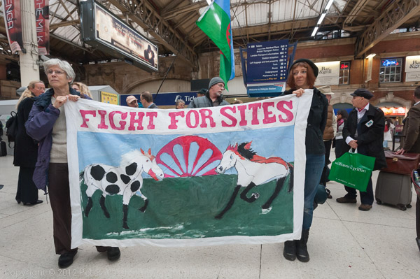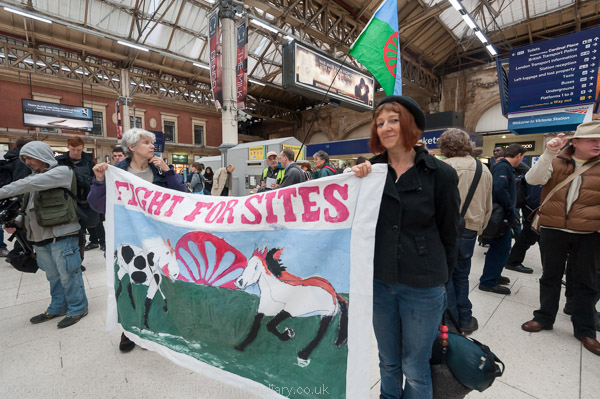 In Victoria Station: Board panels were painted as caravan sides to carry in the protest