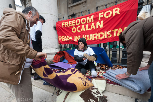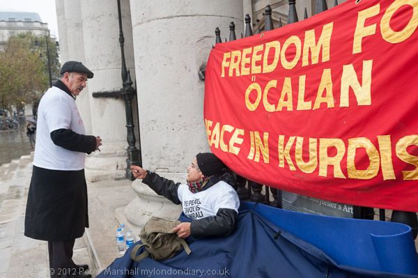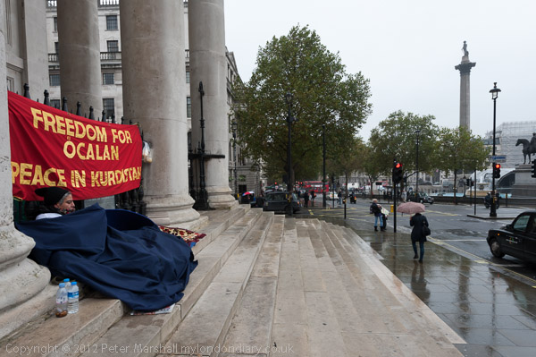 'Freedom for Ocalan, Peace in Kurdistan'. It was a wet day and there were few visitors to Trafalgar Square