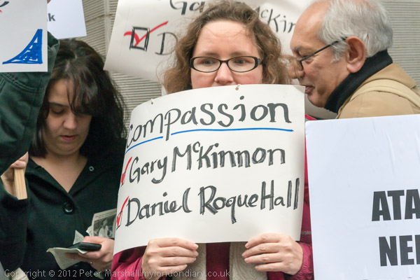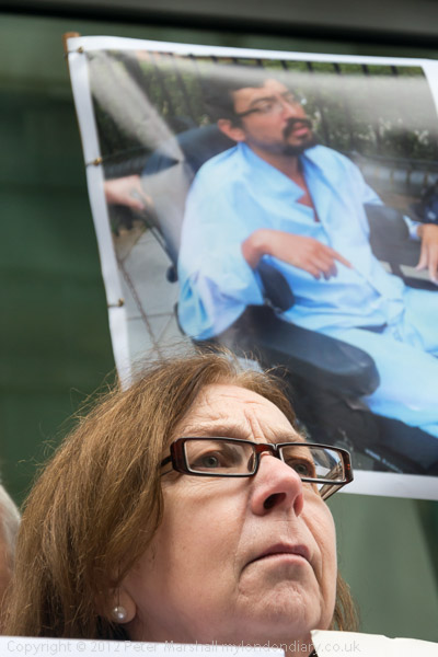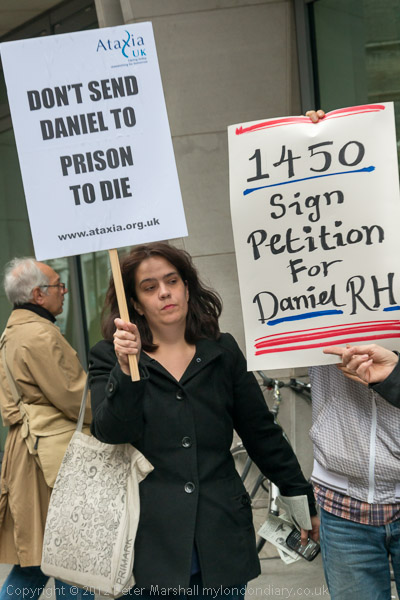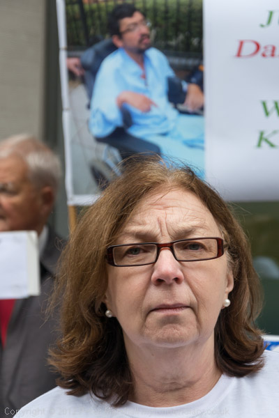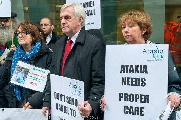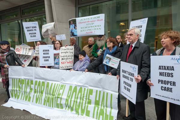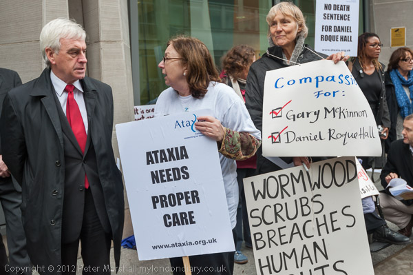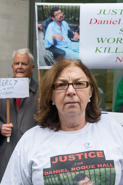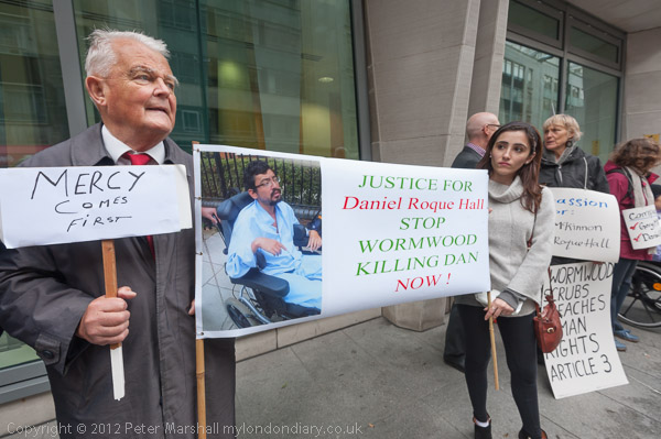 Bruce Kent holds a placard 'Mercy Comes First' and the banner calling for Justice for Daniel Roque Hall