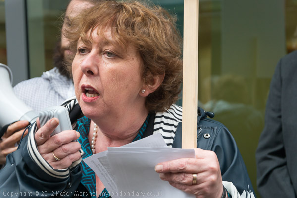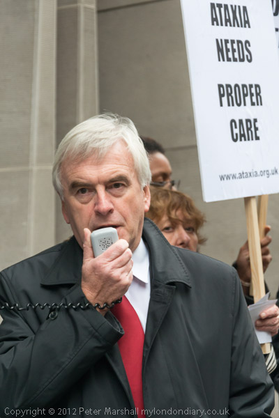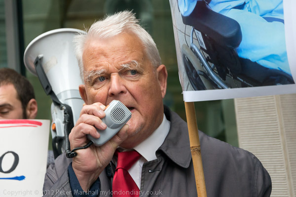 Bruce Kent (left) and John McDonnell MP (right) speaking outside the Justice ministry