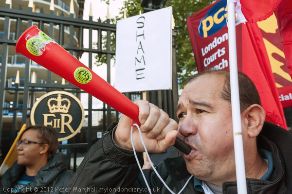 But even more apparent was the noise. Apart from a number of speakers who made use of a powerful megaphone to get their message over, and which was also used to lead some high volume chanting of slogans, many of the protesters had plastic horns or whistles and created a deafening cacophany between those loud chants against Mitie, the contractor who actually employs the cleaners at the Tower.