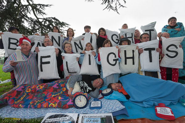 Some of the protesters changed into pyjamas or nightdresses, and others wore dressing gowns and other nightwear. One man carried a large candle, and there were clocks set at 11pm and 6am, the current times between which flights are described as night flights, although the campaign wants to ban all flights between 11pm and 7am to allow for 8 hour sleep.