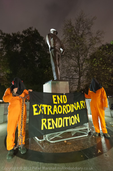 'End Extraordinary Rendition' banner with men in orange suits and black hoods, one in chains under the statue of Eisenhower