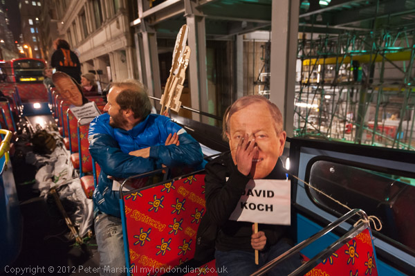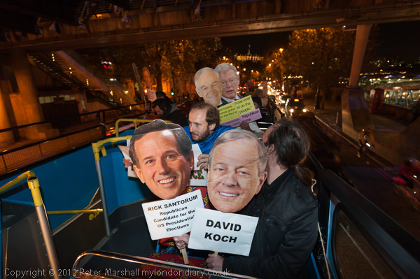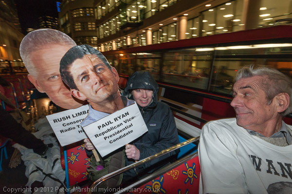 Rush Limbaugh and Paul Ryan with protesters on the top of the bus