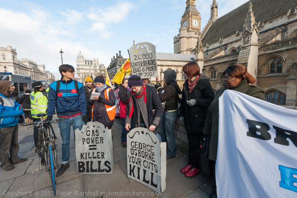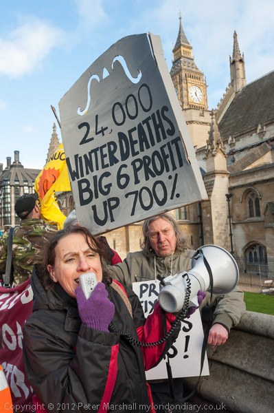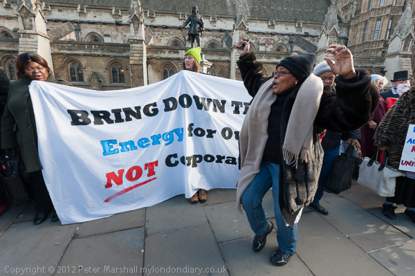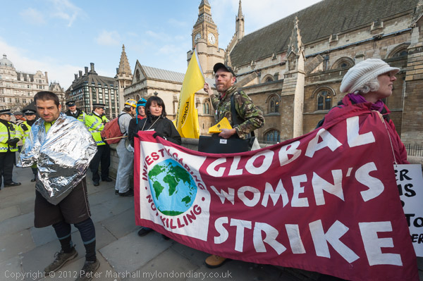 of Parliament. One woman dances in front of the statue of Oliver Cromwell and