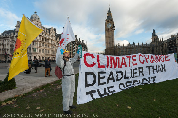 Kick Nuclear with Fukishima flags and a large banner 'Climate Change: Deadlier than the Defecit'