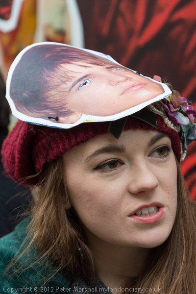 Several of the protesters wore masks showing the face of Justin Bieber