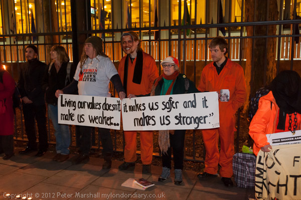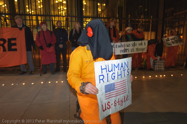 Human Rights US Style - hooded, chained and wearing ear muffs
