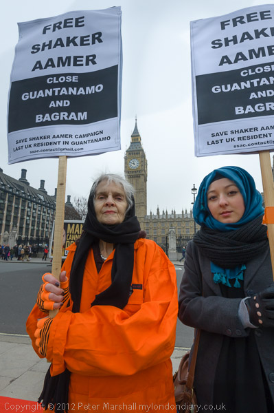 Women with 'Free Shaker Aamer - Close Guantanamo and Bagram' placards