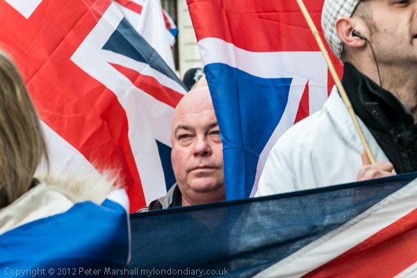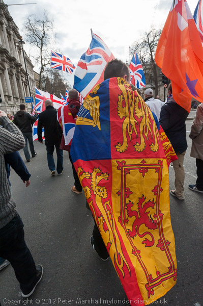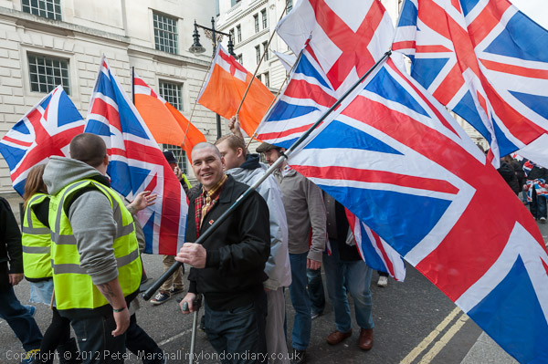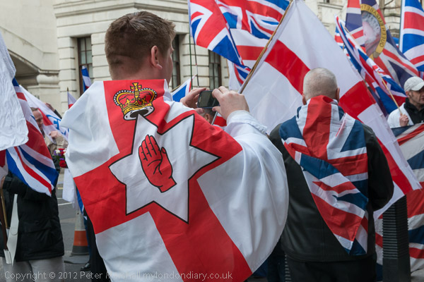 The Red Hand of Ulster on the Ulster flag worn by a marcher taking photographs