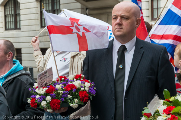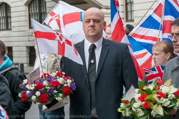 The Friends of the Somme badge on his tie shows the Ulster Memorial Tower at Thiepval.