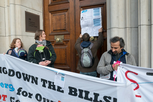 'Can't Pay Won't Pay' on the door of the DECC and people fixed their comments on 'bills' on a washing line