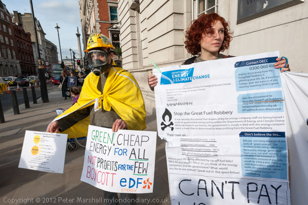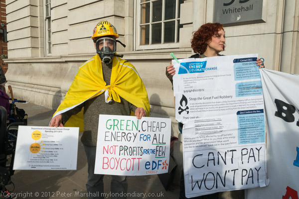 and an anti-nuclear protester calling for Green cheap energy for all, not profits for the few and a boycott of EDF