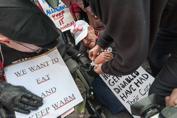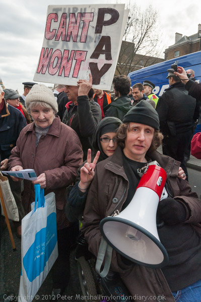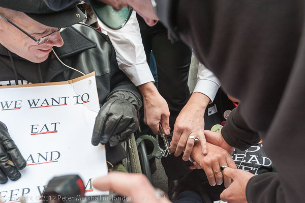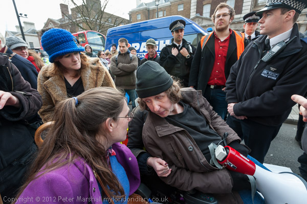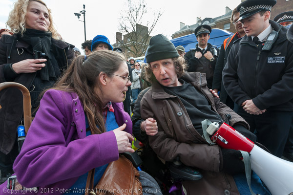 ![]() Meanwhile, the padlocked pensioner had a problem - he couldn't undo the padlock. Police came to the rescue ![]() first cutting the chain ![]() and then removing he padlock from the wheelchair - and a few minutes later the bracelet from the protester's wrist ![]() ![]() Police come to talk to the protesters, who argue that this is the only way they can make their views felt ![]() The police seem sympathetic but want to get traffic moving again, although they have diverted it via a side street ![]() |