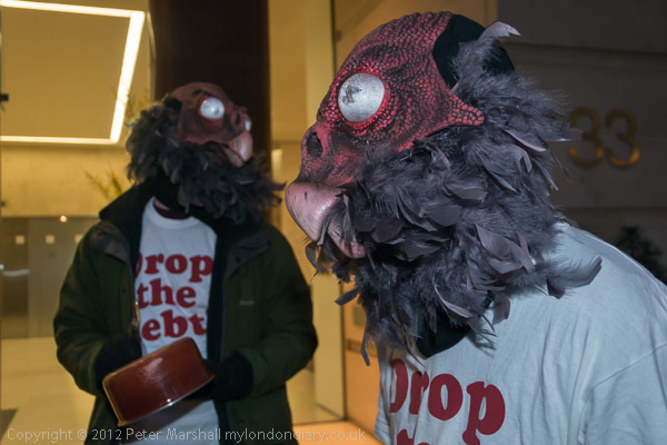 The 'No Vultures' graphic on the banner - and a vulture with a placard