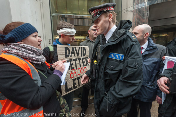 The group with banners and placards against PFI, then marched off to Cheapside, stopping at the corner with Gutter Lane for a few short speeches about Innisfree and its complicity in the PFI scheme. While a few of the protesters stayed on Cheapside to hand out leaflets, the rest walked down Gutter Lane to the aptly named Abacus House where Innisfree have offices on one of the higher floors. Security, backed up by police, prevented them from entering to seek a meeting with David Metter who owns 75% of Innisfree, and after some argument with police they were allowed to stand on the pavement outside to hold a rally.