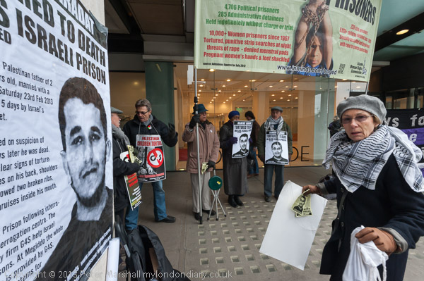 Activists protested outside the Westminster HQ of G4S which provides security services to the Israeli prison and interrogation centre where Palestinian Arafat Jaradat died after being tortured last week.