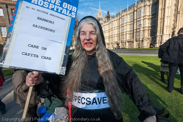 Among those attending the rally, some had brought banners and placards from the various campaigns around London, but the presence of a campaigner from Yorkshire stressed that this was a national problem and a national campaign. As well as placards there were two street theatre activists who took part in a 'Funeral of the NHS' as a part of the campaign to save Ealing Hospital.