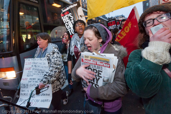 Budget Day protesters marched to a rally at Downing St, calling for an end to cuts and for a programme that would provide jobs and protect the poor rather than enrich the already wealthy, ditching Trident and stopping privatisation of the NHS.