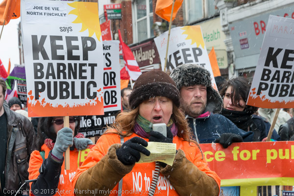 Despite a temperature of around zero and a weather forecast that predicted a day of wind chill, sleet and snow, people gathered for the march at Finchley Central station and stood and listened to a number of speakers from local community groups and others from across London. The protest was called by the Barnet Alliance for Public Services and had attracted a wide range of support from other local groups as well as trade unions and campaigning groups including DPAC, Whittington and Lewisham Hospital campaigns and Save Barnet NHS, Labour and Green party branches and others. Among the speakers before the march were Labour MPs John McDonnell and Jeremy Corbyn and Green Party Greater London Assembly member Jenny Jones AM.