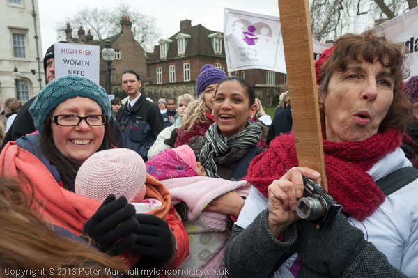 Over 250 women, many carrying small children, arrived on a near freezing morning for the protest, and as well as speeches from midwives and other professionals there were a number of mothers who gave testimony to the excellent level of service that is provided by independent midwives, including one who described herself as an 'ordinary mother' who had been dissatisfied by the local NHS provision, and said although she could not afford private care, had 'saved sixpences' by not buying chocolate, and although she still could not afford the full fee had found an independent midwife who was prepared to work with her and deliver her child. Like the other mothers who spoke, some who had had children normally while the NHS would have insisted on a Caesarian, or had been refused a home delivery on grounds of age, she was delighted with the level of personal care and support provided.