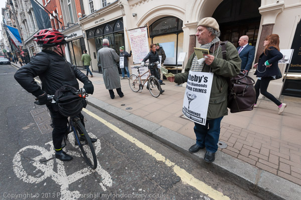 Protesters stood outside Sotheby's Mayfair premises today, opposing their partnership with the Steinmetz Diamond Group which they allege launders illicit blood diamonds and sponsors the Israeli Givati Brigade accused of war crimes in Gaza.