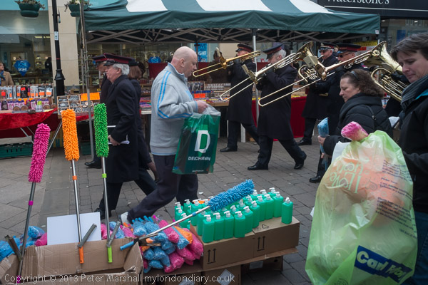 As well as cutting down on those attending the march, the appalling weather also meant there were fewer people out on the streets to see the march, but as it went past shops a number of people came to the windows or came outside to watch and show their support, with some coming out to contribute to the collecting buckets.