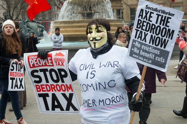 Hundreds of protesters gathered in Trafalgar Square to show their opposition to the Bedroom Tax and other government measures against the poor; marching to Downing St, they sat down in Whitehall, some hanging shirts expressing their anger on the gates opposite.