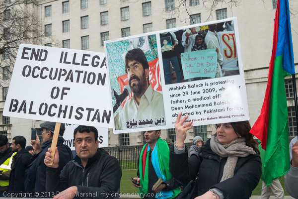 Protesters in London called for freedom for Balochistan, merged with Pakistan in 1948, and for an end to Pakistani death squads and disappearances of Balochs and persecution in Iran.